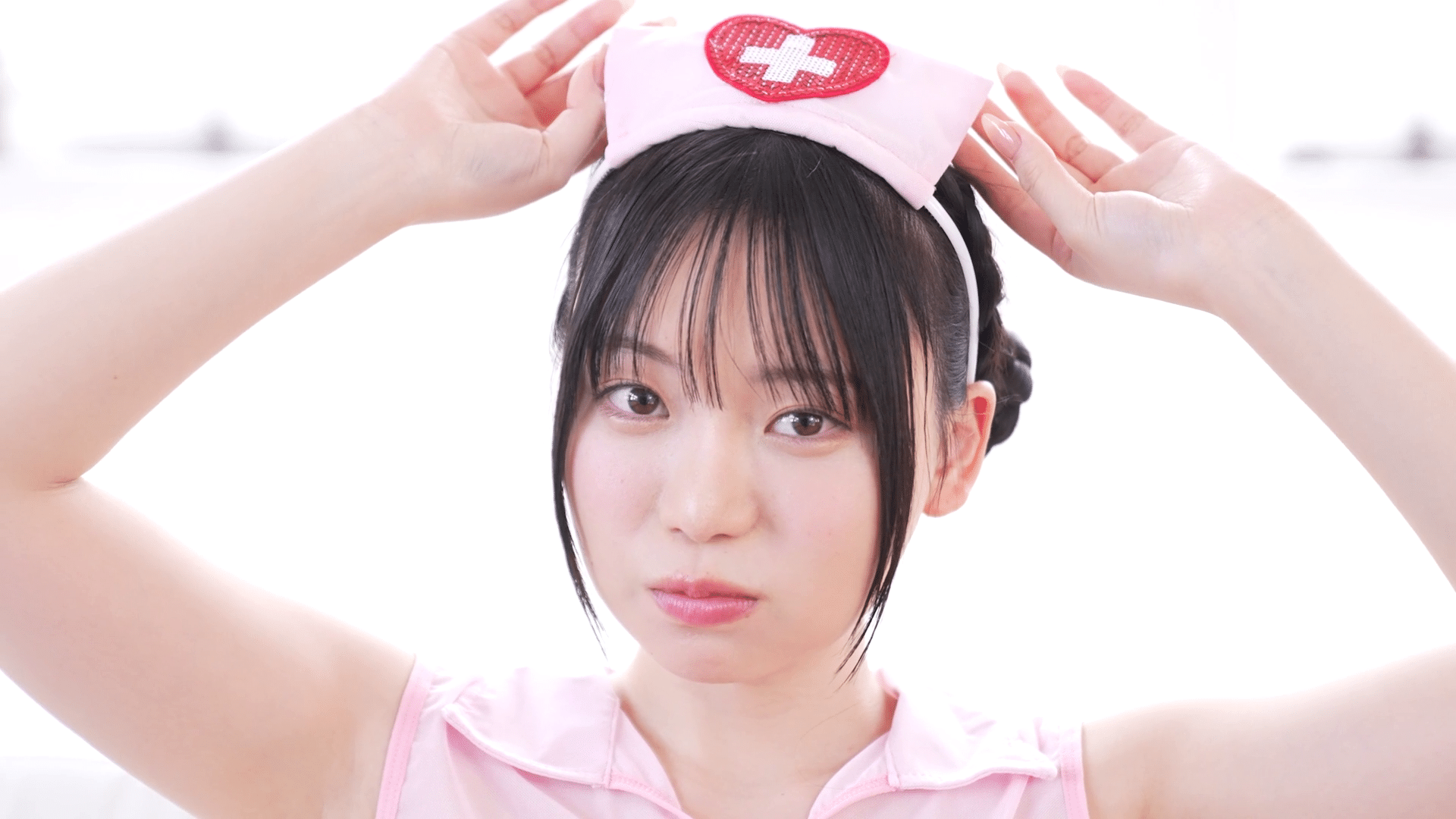 乳首が透けたピンクのナース姿で登場する美少女!
